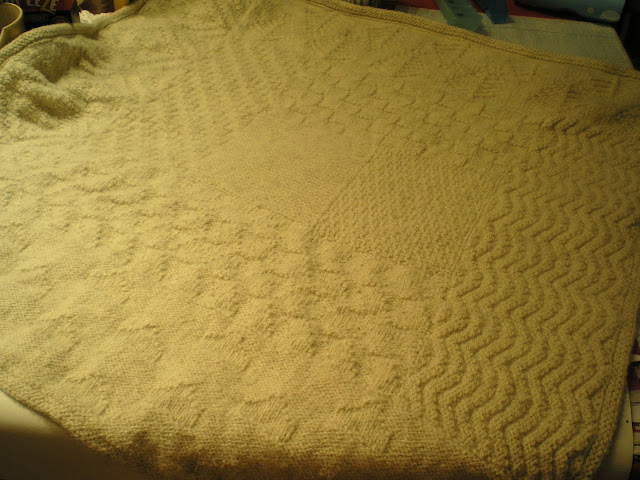 It's a log cabin style, knitted from the center out with each square/rectangle knitted onto the ones before so no seaming at the end. I made a different stitch pattern in each rectangle.  I tried to use patterns that would look good from either side.  I think blankets need to be reversible.  I used Ralene's Jacob yarn, worsted weight.  If you wash it in the machine with lots of fabric softener it gets pretty soft, and so dense and warm that I thought it would be good for a February baby.